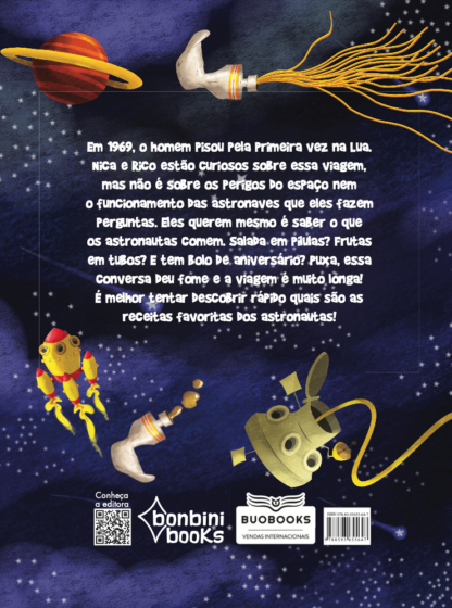 Em 1969, o homem pisou pela primeira vez na Lua. Nica e Rico estão curiosos sobre essa viagem, mas não é sobre os perigos do espaço nem o funcionamento das astronaves que eles fazem perguntas. Eles querem mesmo é saber o que os astronautas comem. Salada em pílulas? Frutas em tubos? E tem bolo de aniversário? Puxa, essa conversa deu fome e a viagem é muito longa! É melhor tentar descobrir rápido quais são as receitas favoritas dos astronautas!