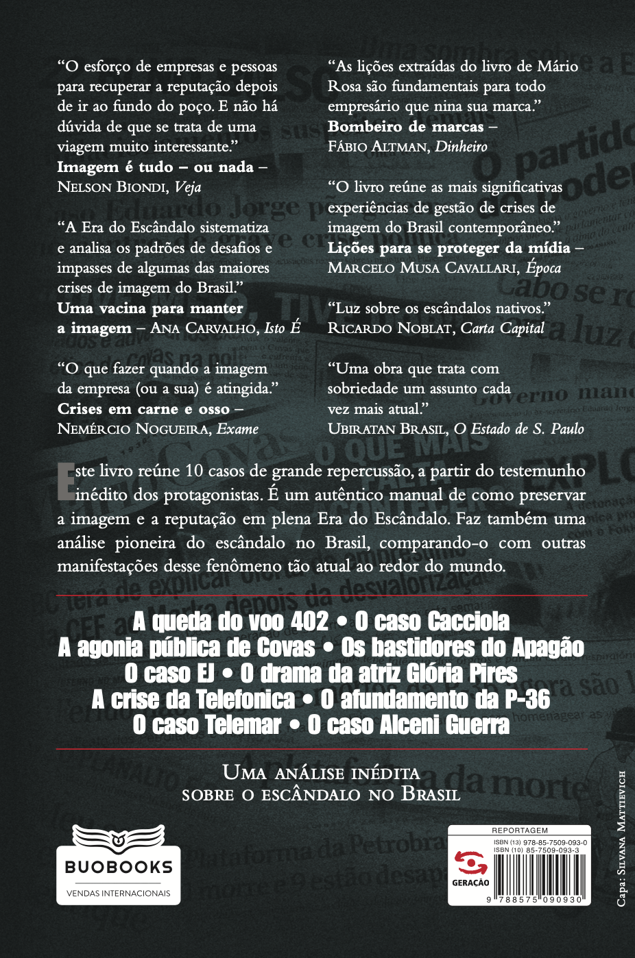 A era do escândalo mostra como funciona a “linha de montagem” dos escândalos na mídia e na sociedade brasileira. Então que fazer para proteger sua credibilidade numa crise? Estas e muitas outras perguntas cruciais são abordadas de forma inédita pelo consultor de imagem Mário Rosa.