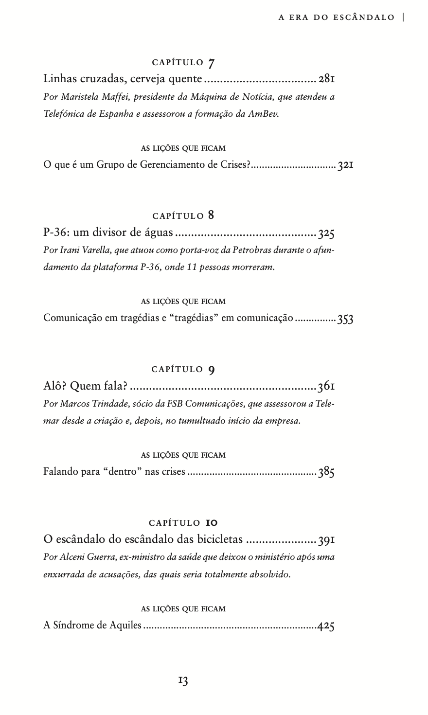O livro reúne 10 casos de grande repercussão no Brasil e no mundo, relatados em primeira pessoa a partir do testemunho inédito dos protagonistas. Eles ensinam como empresas de grande porte, políticos, profissionais liberais e artistas, todos de expressão nacional, superaram grandes crises. Além disso, traz uma análise inédita do escândalo no Brasil, demonstrando que ele é muito diferente do de outros países.