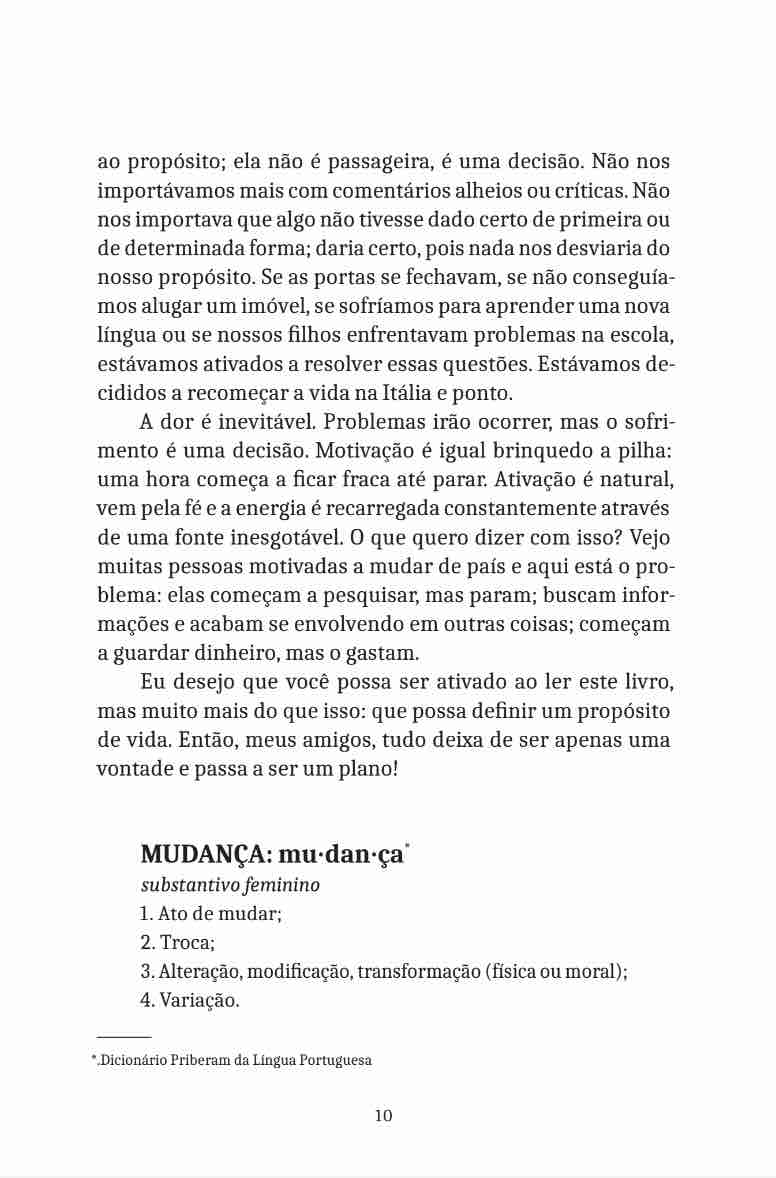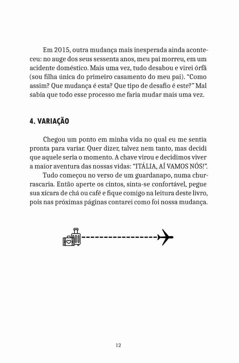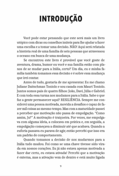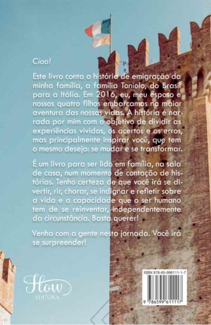 Este livro conta a história de emigração da minha família, a família Toniolo, do Brasil para a Itália. Em 2016, eu, meu esposo e nossos quatro fi lhos embarcamos na maior aventura das nossas vidas. A história é nar-rada por mim com o objetivo de dividir as experiências vividas, os acertos e os erros, mas principalmente inspirar você, que tem o mesmo desejo: se mudar e se transformar.É um livro para ser lido em família, na sala de casa, num momento de contação de his-tórias. Tenho certeza de que você irá se di-vertir, rir, chorar, se indignar e refl etir sobre a vida e a capacidade que o ser humano tem de se reinventar, independentemente da circunstância. Basta querer!Venha com a gente nesta jornada. Você irá se surpreender!