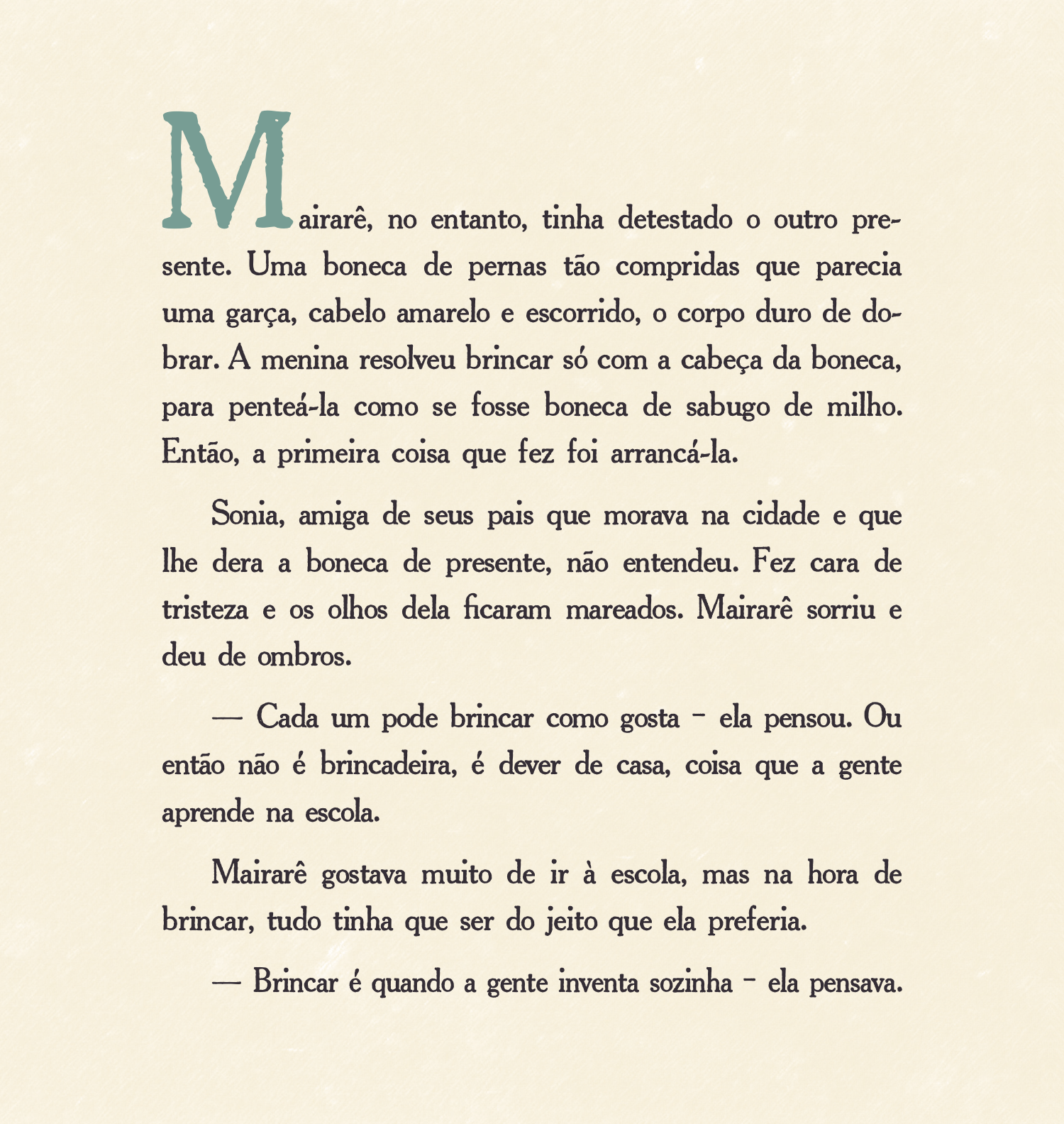 A pequena Mairarê brinca com tucanos, mas gosta de assistir desenhos na TV; aprende português na escola, mas fala guarani com sua família; vive em uma aldeia, mas vai ao supermercado para fazer compras. Neste livro, o universo indígena brasileiro é mostrado de forma mágica e singela através de uma história que também fala sobre a infância e suas descobertas. Um retrato da criança indígena urbana. Nas ilustrações, as cores e as formas da Mata Atlântica e da cultura guarani desfilam diante dos olhos do leitor.