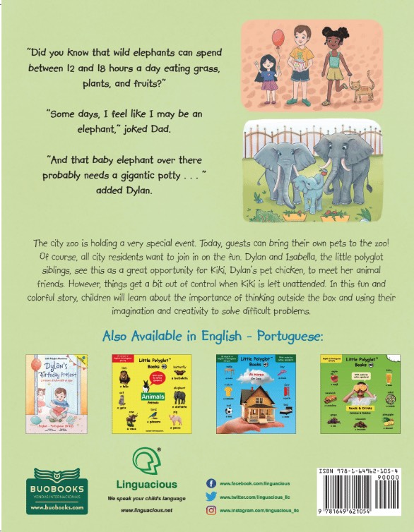 Esta é a versão bilíngue em português e inglês deste livro. O zoológico da cidade está realizando um evento muito especial. Hoje, os hóspedes podem trazer seus próprios animais de estimação para o zoológico! Claro, todos os residentes da cidade querem se juntar à diversão. Dylan e Isabella, os pequenos irmãos poliglotas, veem isso como uma grande oportunidade para Kiki, a galinha de estimação de Dylan, encontrar seus amigos animais. No entanto, as coisas ficam um pouco fora de controle quando Kiki é deixada sem supervisão. Nesta história divertida e colorida, as crianças aprenderão sobre a importância de pensar fora da caixa e usar sua imaginação e criatividade para resolver problemas difíceis. Read moreUS$22.90