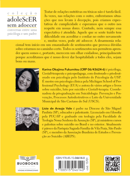 Karina Okajima Fukumitsu (CRP 06/43624-6) é psicóloga, Gestalt-terapeuta e psicopedagoga, com doutorado e pós-doutorado em psicologia pelo Instituto de Psicologia da USP.É mestre em psicologia clínica pela Michigan School of Professional Psychology (EUA) e autora de vários artigos e livros sobre suicídio, luto por suicídio e Gestalt-terapia. Coordena dora da pós-graduação em Suicidologia: Prevenção e Posvenção, Processos Autodestrutivos e Luto da Universidade Municipal de São Caetano do Sul (USCS). Licio de Araujo Vale é padre na Diocese de São Miguel Paulista (SP), educador e palestrante. Licenciado em filosofia pela PUC-SP e graduado em teologia pela Faculdade de Teologia Nossa Senhora da Assunção (SP), já ministrou cursos e palestras sobre suicídio no Brasil e no exterior. Atualmente é pároco da Paróquia Sagrada Família de Vila Praia, São Paulo (SP), e membro da Associação Brasileira de Estudos e Prevenção ao Suicídio (ABEPS).You must be logged in to post a review.