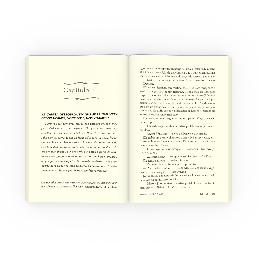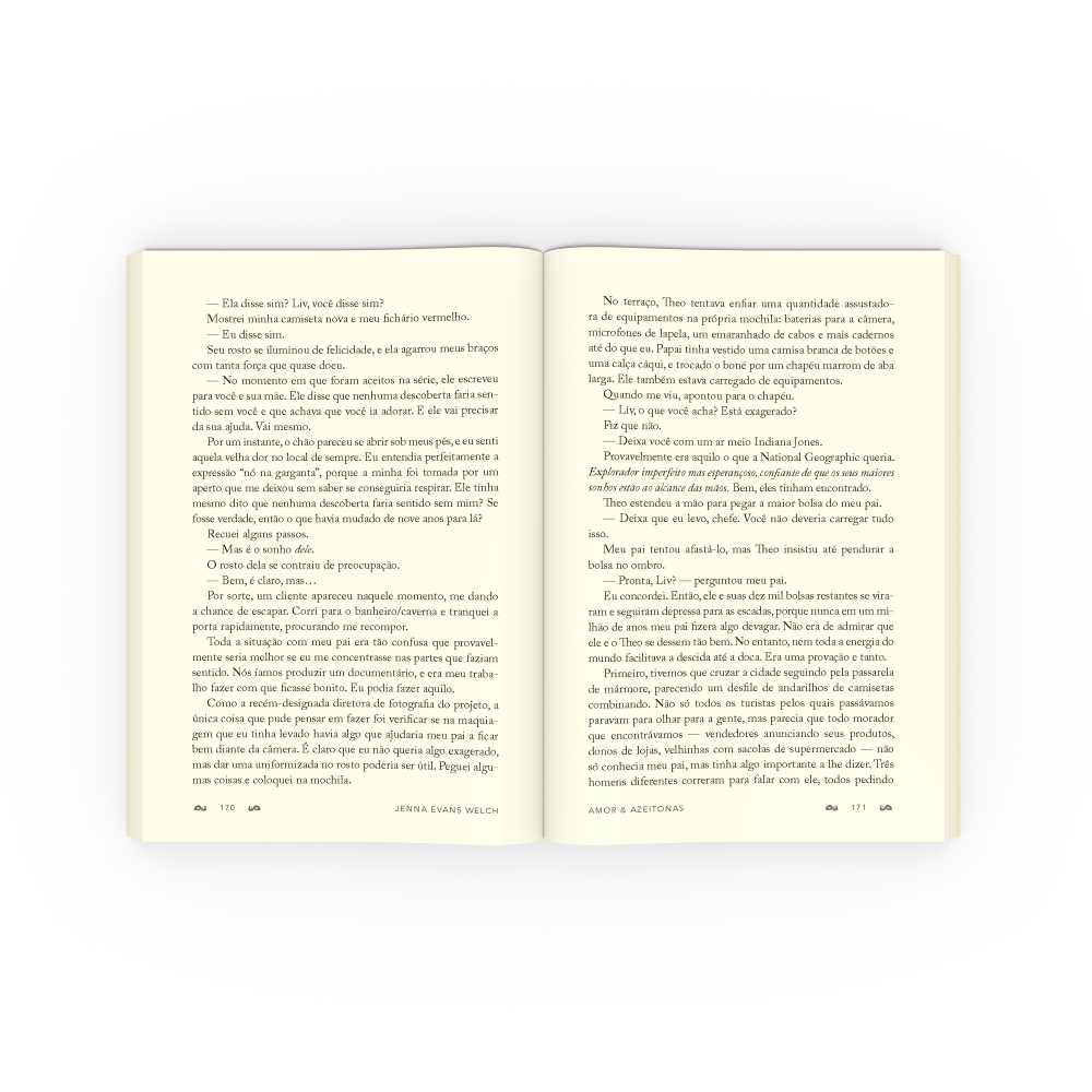 Com mais de 105 mil exemplares vendidos no Brasil, as histórias de Jenna Evans Welch trazem protagonistas que desbravam o mundo em uma verdadeira jornada de amadurecimento, com direito a segredos de família e romances inesquecíveis. Após conquistar corações com Amor & gelato, que se passa na Itália, e Amor & sorte, que explora a Irlanda, é a vez de nos apaixonarmos por uma ilha grega repleta de mistérios em Amor & azeitonas.