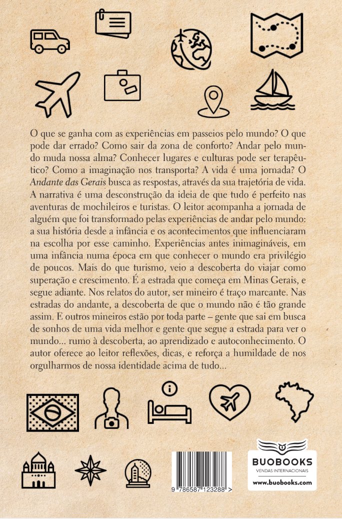 Experiências antes inimagináveis, em uma infância numa época em que conhecer o mundo era privilégio de poucos. Mais do que turismo, veio a descoberta do viajar como superação e crescimento. É a estrada que começa em Minas Gerais, e segue adiante. Nos relatos do autor, ser mineiro é traço marcante. Nas estradas do andante, a descoberta de que o mundo não é tão grande assim. E outros mineiros estão por toda parte – gente que sai em busca de sonhos de uma vida melhor e gente que segue a estrada para ver o mundo... rumo à descoberta, ao aprendizado e autoconhecimento.