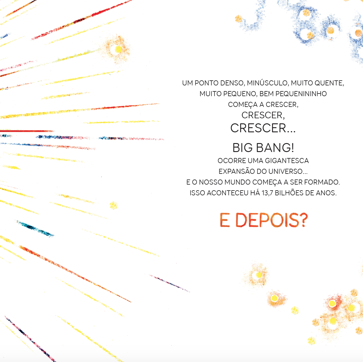 MERGULHE NESTA HISTÓRIA! Um ponto denso, minúsculo e muito quente começa a crescer, e crescer... e BIG BANG! E assim tem início tudo que conhecemos hoje, desde os seres vivos até as estrelas mais distantes. Este é um livro corajoso, que aceitou a difícil tarefa de apresentar assuntos complexos, como o evolucionismo e a Teoria do Big Bang, de forma simples para crianças. O resultado é uma obra surpreendente, ilustrações belíssimas e texto poético.