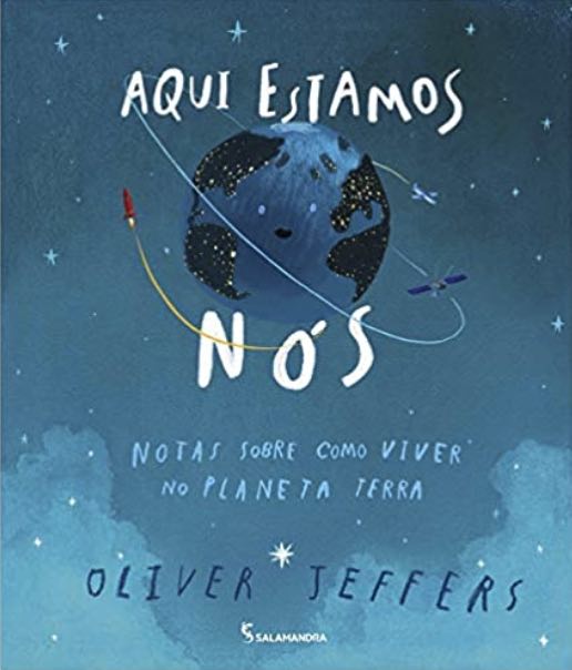 Em Aqui estamos nós, Oliver Jeffers nos convida a refletir sobre o imenso planeta que nos acolhe e, principalmente, sobre a vida que levamos nele. Assumindo a voz de um pai que está conversando com seu filho recém-nascido, situação real que inspirou a escrita do livro, o autor gentilmente nos apresenta o planeta sob diversos pontos de vista. Assim, com pequenos conselhos que valorizam a vida, o carinhoso pai repassa ao filho singelas e divertidas lições de sobrevivência na Terra. E, entre tantas importantes reflexões, uma delas com certeza ficará mais forte na mente do jovem leitor: não estamos sozinhos aqui. Como uma gota no oceano, somos apenas um entre os bilhões de seres vivos que vivem sobre a Terra. Assim, fica fácil compreender por que partilhar, tolerar e respeitar são verbos fundamentais para o nosso manual de sobrevivência.