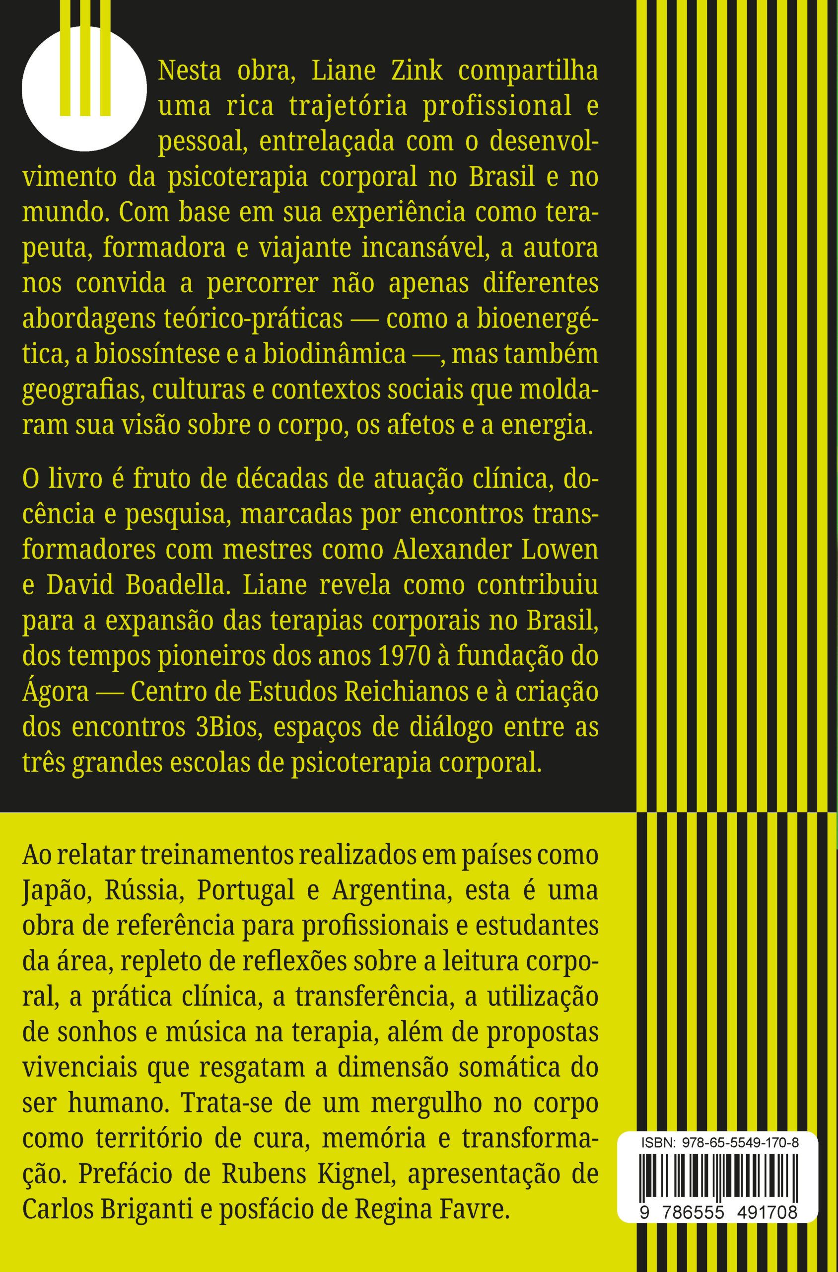 Nesta obra, Liane Zink compartilha uma rica trajetória profissional e pessoal, entrelaçada com o desenvolvimento da psicoterapia corporal no Brasil e no mundo. Com base em sua experiência como terapeuta, formadora e viajante incansável, a autora nos convida a percorrer não apenas diferentes abordagens teórico‑práticas — como a bioenergética, a biossíntese e a biodinâmica —, mas também geografias, culturas e contextos sociais que moldaram sua visão sobre o corpo, os afetos e a energia.