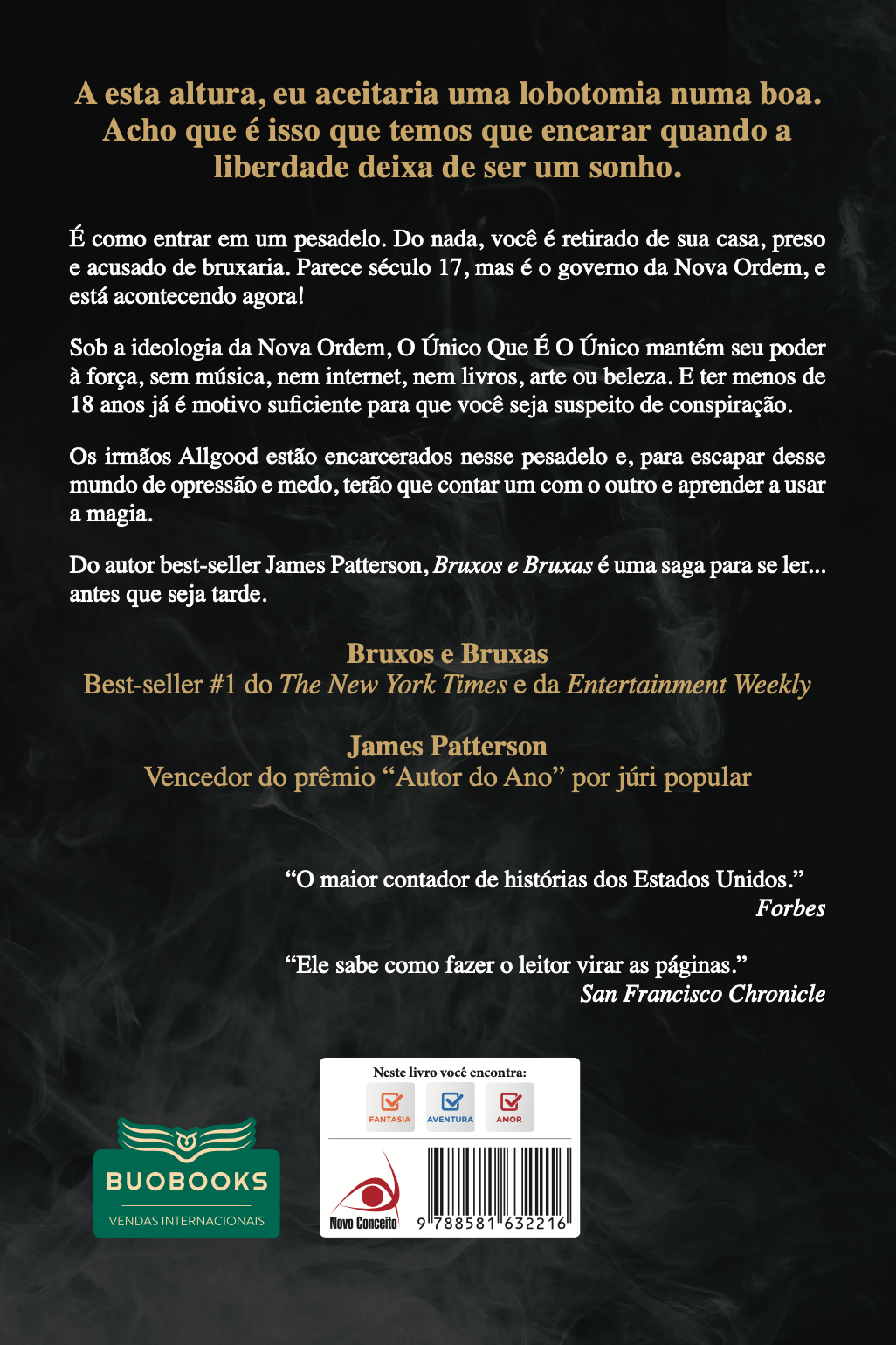 É como entrar em um pesadelo. Do nada, você é retirado de sua casa, preso, e acusado de bruxaria. Parece século 17, mas é o governo da Nova Ordem, e está acontecendo agora! Sob a ideologia da Nova Ordem, O Único Que É O Único mantém seu poder à força, sem música, nem internet, nem livros, arte ou beleza. E ter menos de 18 anos já é motivo suficiente para que você seja suspeito de conspiração. Os irmãos Allgood estão encarcerados nesse pesadelo e, para escapar desse mundo de opressão e medo, terão que contar um com o outro e aprender a usar a magia.Do autor best-seller James Patterson, "Bruxos e Bruxas" é uma saga para se ler... antes que seja tarde.