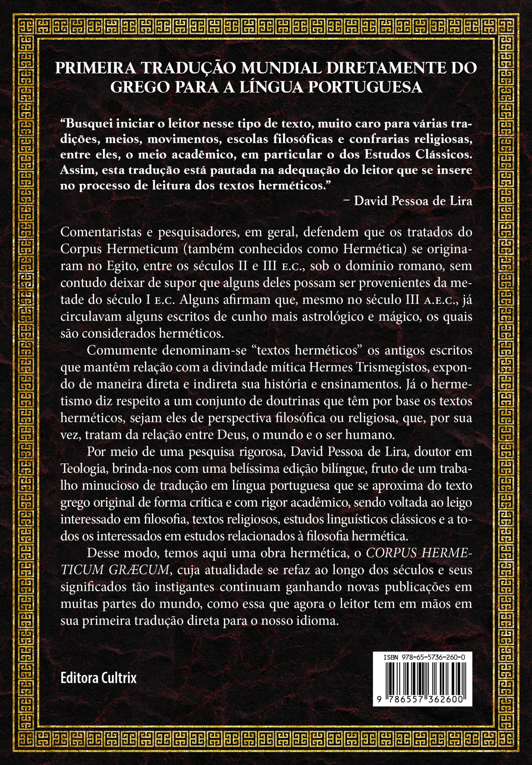 Primeira tradução mundial diretamente do grego para a língua portuguesa, esta edição bilíngue do clássico Corpus Hermeticum, obra icônica da filosofia hermética, foi traduzida e organizada por David Pessoa de Lira, doutor em Teologia. Fruto de um trabalho minucioso de tradução em língua portuguesa que se aproxima do texto grego original de forma crítica e com rigor acadêmico, sendo voltada ao leigo interessado em filosofia, textos religiosos, estudos linguísticos clássicos e a todos os interessados em estudos relacionados à filosofia hermética. A atualidade de CORPUS HERMETICUM GRÆCUM se refaz ao longo dos séculos e seus significados tão instigantes continuam ganhando novas publicações em muitas partes do mundo.