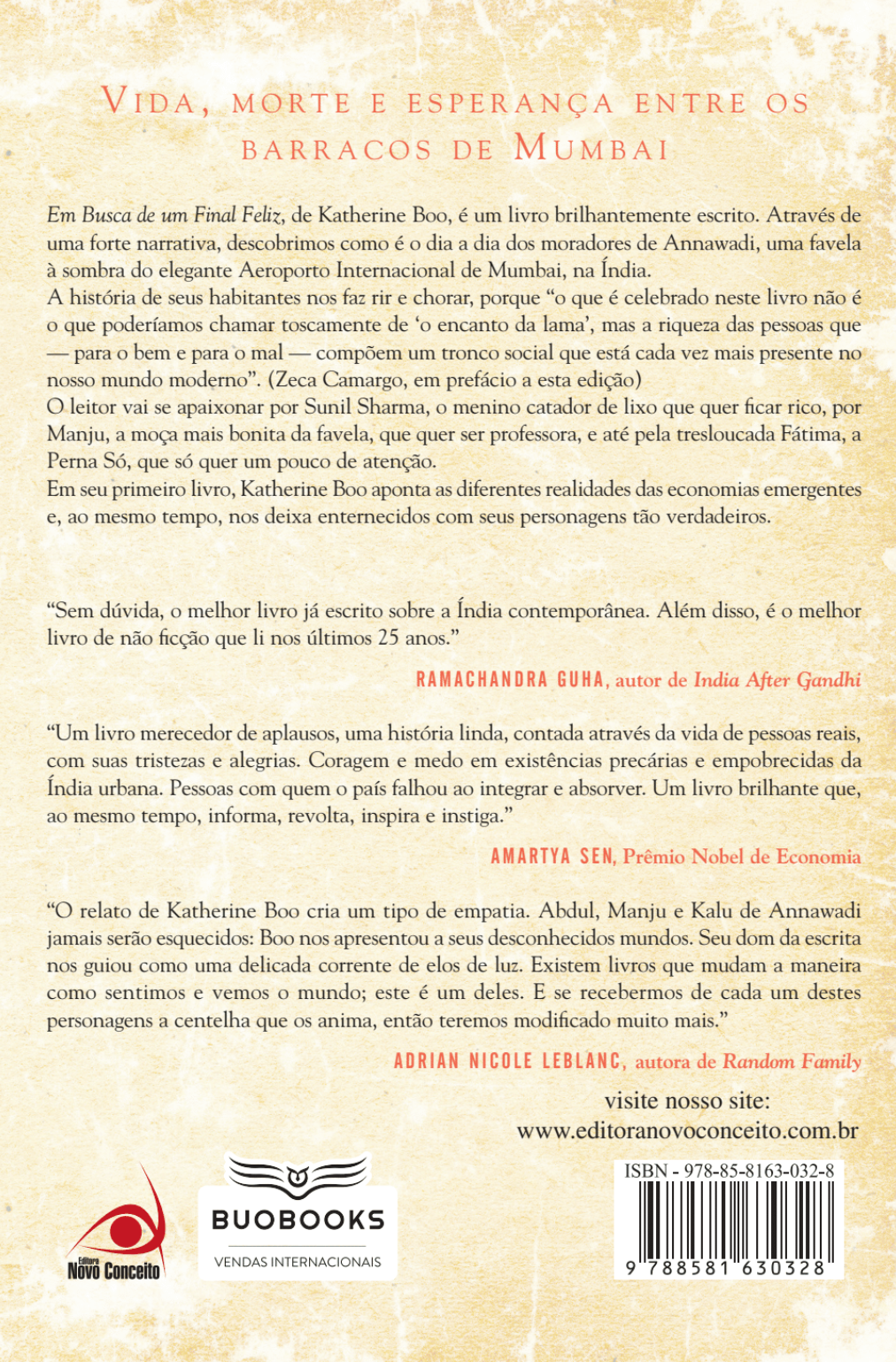Em Busca de um final feliz é um livro brilhantemente escrito pela jornalista Katherine Boo, ganhadora do prêmio Pulitzer e autora bestseller do The New York Times.
