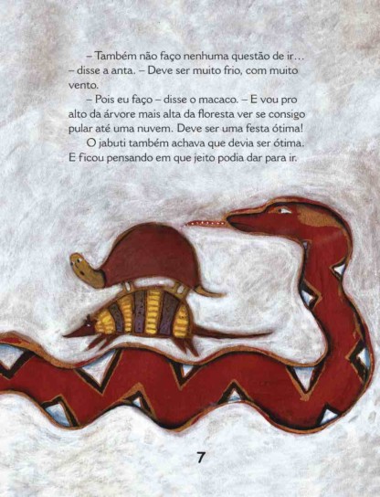 O assunto em alta era a festa no céu, na qual só entrariam os animais que voassem. Os outros bichos ficaram revoltados, especialmente o jabuti. Ele não desistiu: foi de carona com a garça. Será que o jabuti vai, finalmente, participar dessa festa?