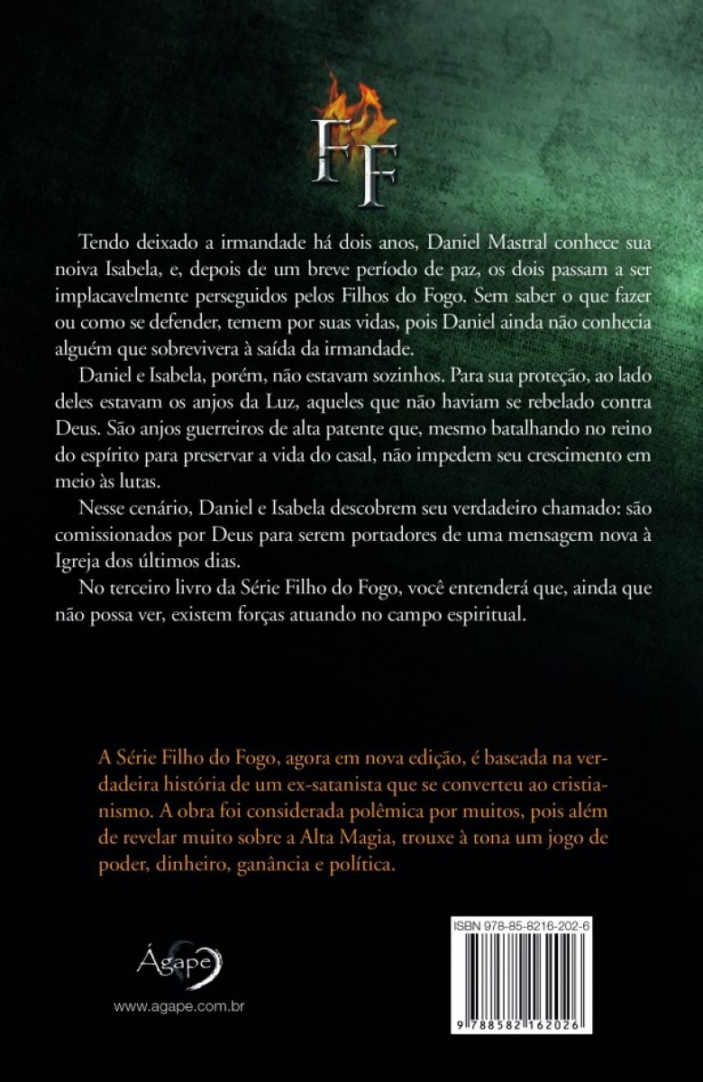 Tendo deixado a irmandade há dois anos, Daniel Mastral conhece sua noiva Isabela, e, depois de um breve período de paz, os dois passam a ser implacavelmente perseguidos pelos Filhos do Fogo. Sem saber o que fazer ou como se defender, temem por suas vidas, pois Daniel ainda não conhecia alguém que sobrevivera à saída da irmandade.Daniel e Isabela, porém, não estavam sozinhos. Para sua proteção, ao lado deles estavam os anjos da Luz, aqueles que não haviam se rebelado contra Deus. São anjos guerreiros de alta patente que, mesmo batalhando no reino do espírito para preservar a vida do casal, não impedem seu crescimento em meio às lutas.Nesse cenário, Daniel e Isabela descobrem seu verdadeiro chamado: são comissionados por Deus para serem portadores de uma mensagem nova à Igreja dos últimos dias.No terceiro livro da Série Filho do Fogo, você entenderá que, ainda que não possa ver, existem forças atuando no campo espiritual.A Série Filho do Fogo, agora em nova edição, é baseada na verdadeira história de um ex-satanista que se converteu ao cristianismo. A obra foi considerada polêmica por muitos, pois além de revelar muito sobre a Alta Magia, trouxe à tona um jogo de poder, dinheiro, ganância e política.