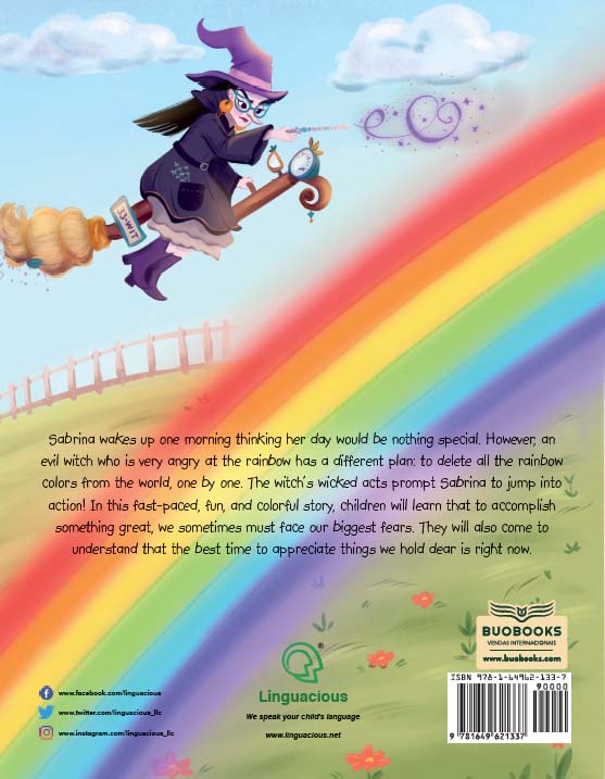 Esta é a edição bilíngue em português do Brasil e inglês deste livro. Sabrina acordou esta manhã achando que seu dia não seria nada especial. No entanto, uma bruxa malvada que está enfezada com o arco-íris tem um plano diferente: apagar do mundo todas as cores do arco-íris, uma a uma. Sabrina decide agir antes que seja tarde demais. Nesta divertida história de ritmo acelerado e cheia de cores, as crianças aprenderão que, às vezes, precisamos encarar os nossos maiores medos para realizar grandes feitos. Aprenderão também que o melhor momento para valorizarmos aquilo que amamos é o agora.