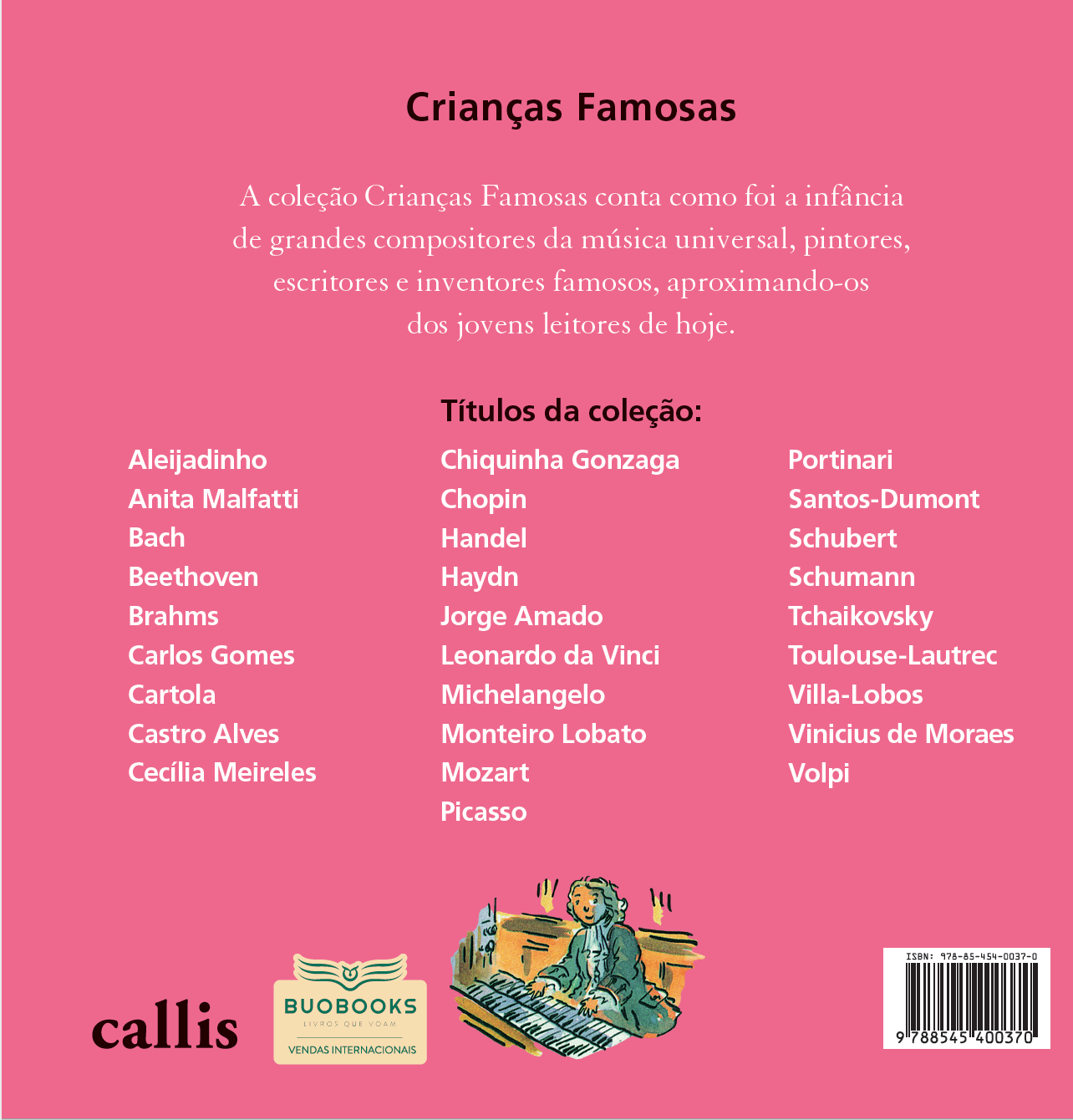 Quem foi Händel? Georg Friedrich Händel foi um compositor alemão, naturalizado cidadão britânico em 1726. Desde cedo mostrou notável talento musical, e a despeito da oposição de seu pai, que o queria um advogado, conseguiu receber um treinamento qualificado na arte da música. A primeira parte de sua carreira foi passada em Hamburgo, como violinista e maestro da orquestra da ópera local. Depois dirigiu-se para a Itália, onde conheceu a fama pela primeira vez, estreando várias obras com grande sucesso e entrando em contato com músicos importantes. Em seguida foi indicado mestre de capela do Eleitor de Hanôver, mas pouco trabalhou para ele, e esteve na maior parte do tempo ausente, em Londres. Seu patrão mais tarde se tornou rei da Grã-Bretanha como Jorge I, para quem continuou compondo. Fixou-se definitivamente em Londres, e ali desenvolveu a parte mais importante de sua carreira, como autor de óperas, oratórios e música instrumental. Quando adquiriu cidadania britânica adotou o nome George Frideric Handel. Tinha grande facilidade para compor, como prova sua vasta produção, que compreende mais de 600 obras, muitas delas de grandes proporções, entre elas dezenas de óperas e oratórios em vários movimentos. Sua fama em vida foi enorme, tanto como compositor quanto como instrumentista, e mais de uma vez foi chamado de "divino" pelos seus contemporâneos. Sua música se tornou conhecida em muitas partes do mundo, foi de especial importância para a formação da cultura musical britânica moderna, e desde a metade do século XX tem sido recuperada com crescente interesse. Hoje ele é considerado um dos grandes mestres do Barroco musical europeu. Crianças Famosas A coleção Crianças Famosas conta como foi a infância de grandes compositores da música universal, pintores, escritores e inventores famosos, aproximando-os dos jovens leitores de hoje. Títulos da coleção:- Aleijadinho