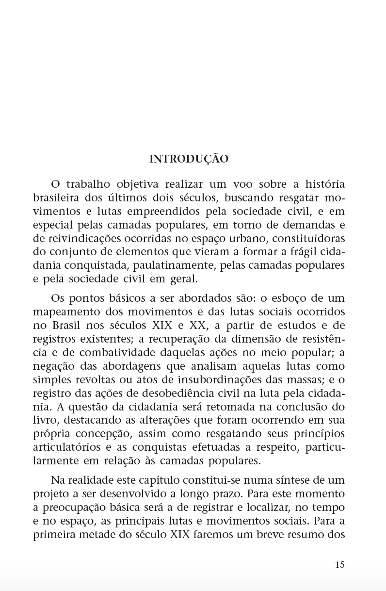 As lutas e movimentos de determinadas categorias ou classes sociais, embora representem um marco importante para a construçao da cidadania, têm sido freqüentemente considerados no estudo da História como eventos marginais, disfunçoes em relaçao à ordem vigente. O objetivo do livro nao é exaltar tais movimentos, mas, na linha dos historiadores Thompson, Hobsbawnn, Rudés, Volvelle, registrar sua ocorrência, resgatar seu papel no contexto da problemática social da época e recuperar suas trajetórias em relaçao à formaçao da cidadania.