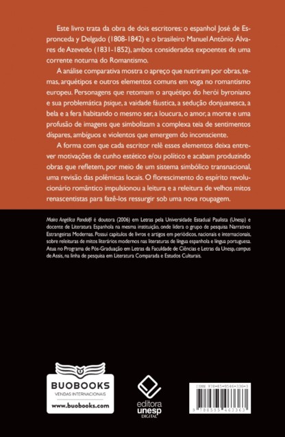 Este livro trata da obra de dois escritores: o espanhol José de Espronceda y Delgado (1808-1842) e o brasileiro Manuel Antônio Álvares de Azevedo (1831-1852), ambos considerados expoentes de uma corrente noturna do Romantismo. A análise comparativa mostra o apreço que nutriram por obras, temas, arquétipos e outros elementos comuns em voga no romantismo europeu. Personagens que retomam o arquétipo do herói byroniano e sua problemática psique, a vaidade fáustica, a sedução donjuanesca, a bela e a fera habitando o mesmo ser, a loucura, o amor, a morte e uma profusão de imagens que simbolizam a complexa teia de sentimentos díspares, ambíguos e violentos que emergem do inconsciente. A forma com que cada escritor relê esses elementos deixa entrever motivações de cunho estético e/ou político e acabam produzindo obras que remetem, por meio de um sistema simbólico transnacional, uma revisão das polêmicas locais. O florescimento do espírito revolucionário romântico impulsionou a leitura e a releitura de velhos mitos renascentistas para fazê-los ressurgir sob uma nova roupagem.