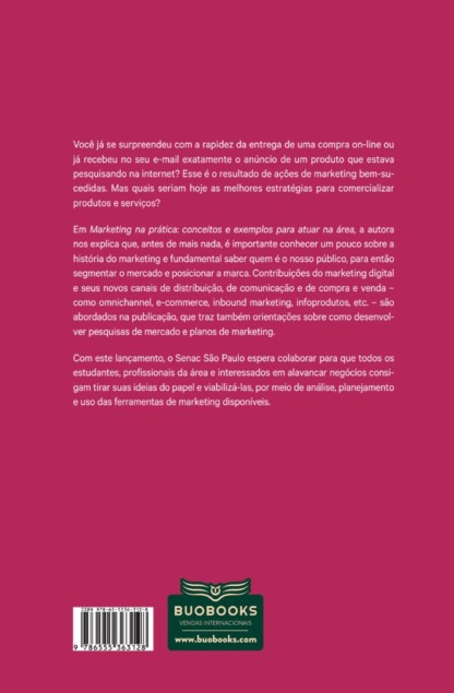 Você já se surpreendeu com a rapidez da entrega de uma compra on-line ou já recebeu no seu e-mail exatamente o anúncio de um produto que estava pesquisando na internet? Esse é o resultado de ações de marketing bem-sucedidas. Mas quais seriam hoje as melhores estratégias para comercializar produtos e serviços? Em Marketing na prática: conceitos e exemplos para atuar na área, a autora nos explica que, antes de mais nada, é importante conhecer um pouco sobre a história do marketing e fundamental saber quem é o nosso público, para então segmentar o mercado e posicionar a marca. Contribuições do marketing digital e seus novos canais de distribuição, de comunicação e de compra e venda, como omnichannel, e-commerce, inbound marketing, infoprodutos, etc., são abordados na publicação, que traz também orientações sobre como desenvolver pesquisas de mercado e planos de marketing. Com este lançamento, o Senac São Paulo espera colaborar para que todos os estudantes, profissionais da área e interessados em alavancar negócios consigam tirar suas ideias do papel e viabilizá-las, por meio de análise, planejamento e uso das ferramentas de marketing disponíveis.