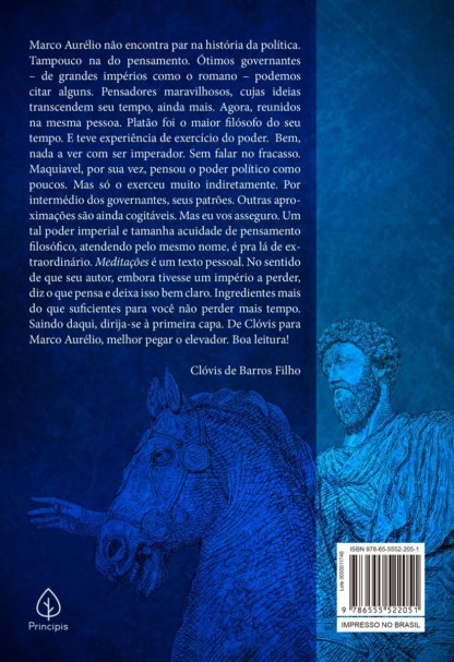 Escritas em grego pelo único imperador romano que também era filósofo, sem intenção de publicação, as Meditações de Marco Aurélio oferecem ao leitor série notável de reflexões espirituais desafiadoras e exercícios desenvolvidos à medida que o imperador lutava para entender a si mesmo e dar sentido ao universo. Enquanto as meditações foram compostas para consolar e fornecer encorajamento pessoal, Marco Aurélio também criou uma das maiores de todas as obras da filosofia: uma coleção atemporal que foi consultada e admirada por estadistas, pensadores e leitores ao longo dos séculos. Texto de Clóvis de Barros Filho.