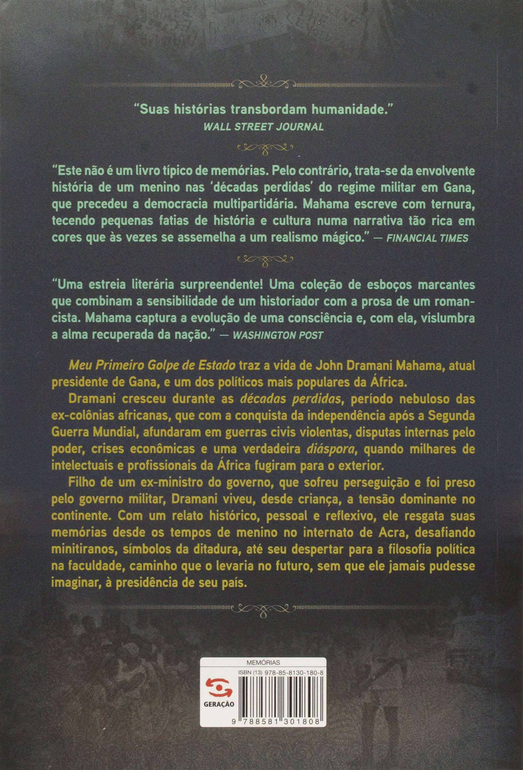 "Meu Primeiro Golpe de Estado" traz a vida de John Dramani Mahama, atual presidente de Gana, e um dos políticos mais populares da África. Dramani cresceu durante as décadas perdidas, período nebuloso das ex-colônias africanas, que com a conquista da independência após a Segunda Guerra Mundial, afundaram em guerras civis violentas, disputas internas pelo poder, crises econômicas e uma verdadeira diáspora, quando milhares de intelectuais e profissionais da África fugiram para o exterior. Filho de um ex-ministro do governo, que sofreu perseguição e foi preso pelo governo militar, Dramani viveu, desde criança, a tensão dominante no continente. Com um relato histórico, pessoal e reflexivo, ele resgata suas memórias desde os tempos de menino no internato de Acra, a desafiar minitiranos, símbolos da ditadura, até seu despertar para a filosofia política na faculdade, caminho que o levaria no futuro, sem que ele jamais pudesse imaginar, à presidência de seu país.