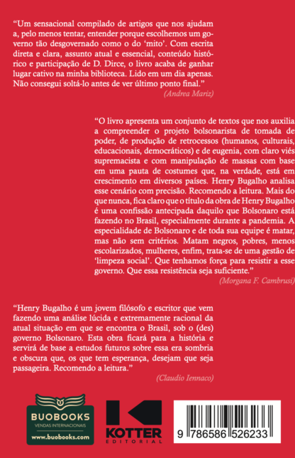 No final de 2017, publiquei no Youtube meu primeiro vídeo sobre Jair Messias Bolsonaro, na época apenas um dos muitos nomes possíveis para uma eventual candidatura à presidência. Naquele momento, a vitória de Bolsonaro parecia inconcebível e muitos analistas políticos, habituados a um processo eleitoral pré-redes sociais, supunham que, uma vez que a engrenagem fosse posta em movimento, o controverso deputado federal seria devorado pelos partidos e candidatos tradicionais. Bem poucos viram na vitória de Trump os sinais daquilo que poderia ocorrer também no Brasil e como uma série de forças históricas se uniria para uma tempestade perfeita. Ao longo de 2018, os índices de intenção de voto de Bolsonaro se mostraram consistentes e a internet servia de termômetro. Cada vez mais a vitória dele se tornava uma possibilidade e, para muitos grupos, principalmente de minorias, a simples ideia de ter um homem com um longo histórico de falas autoritárias, racistas, misóginas e homofóbicas era horripilante. Então Bolsonaro foi o candidato mais votado no primeiro turno, levando à evaporação completa do apoio a demais candidatos da direita ou centro-direita. Enfeixando um conjunto de valores dito conservadores, com suporte dos tais “cidadãos de bem”, de evangélicos neopentecostais, católicos tradicionalistas, alunos de Olavo de Carvalho tornados influenciadores digitais e candidatos, pró-armamentistas, lavajatistas, antipetistas, e com toda uma retórica contra o establishment político, ele conseguiu convencer 57 milhões de eleitores brasileiros de que era a melhor – ou a menos pior — das alternativas. Ainda hoje, muita gente tem dificuldades para compreender o processo que levou à vitória de um político de carreira que, em distintas circunstâncias, afirmou que a sua especialidade era matar, apologista da ditadura militar do Brasil, cujo livro de cabeceira (segundo ele mesmo) é de um torturador conhecido, o mesmo torturador que foi homenageado por Bolsonaro quando anunciou seu voto em favor do impeachment da ex-presidente Dilma Rousseff em 2016, com constrangedores vínculos com milícias cariocas, e que, embora se diga cristão, representa o oposto dos princípios de amor ao próximo e tolerância do Cristianismo. Este livro reúne artigos que publiquei na Folha de SP e na Carta Capital a partir de janeiro de 2019. Neles, empreendo este esforço de compreensão dos eventos que se sucederam desde a eleição de Bolsonaro e o mergulho no abismo de toda uma nação. Hoje, ele ainda está no poder. E ainda não temos ideia de qual será o desfecho desta história. Henry BugalhoSobre o autor