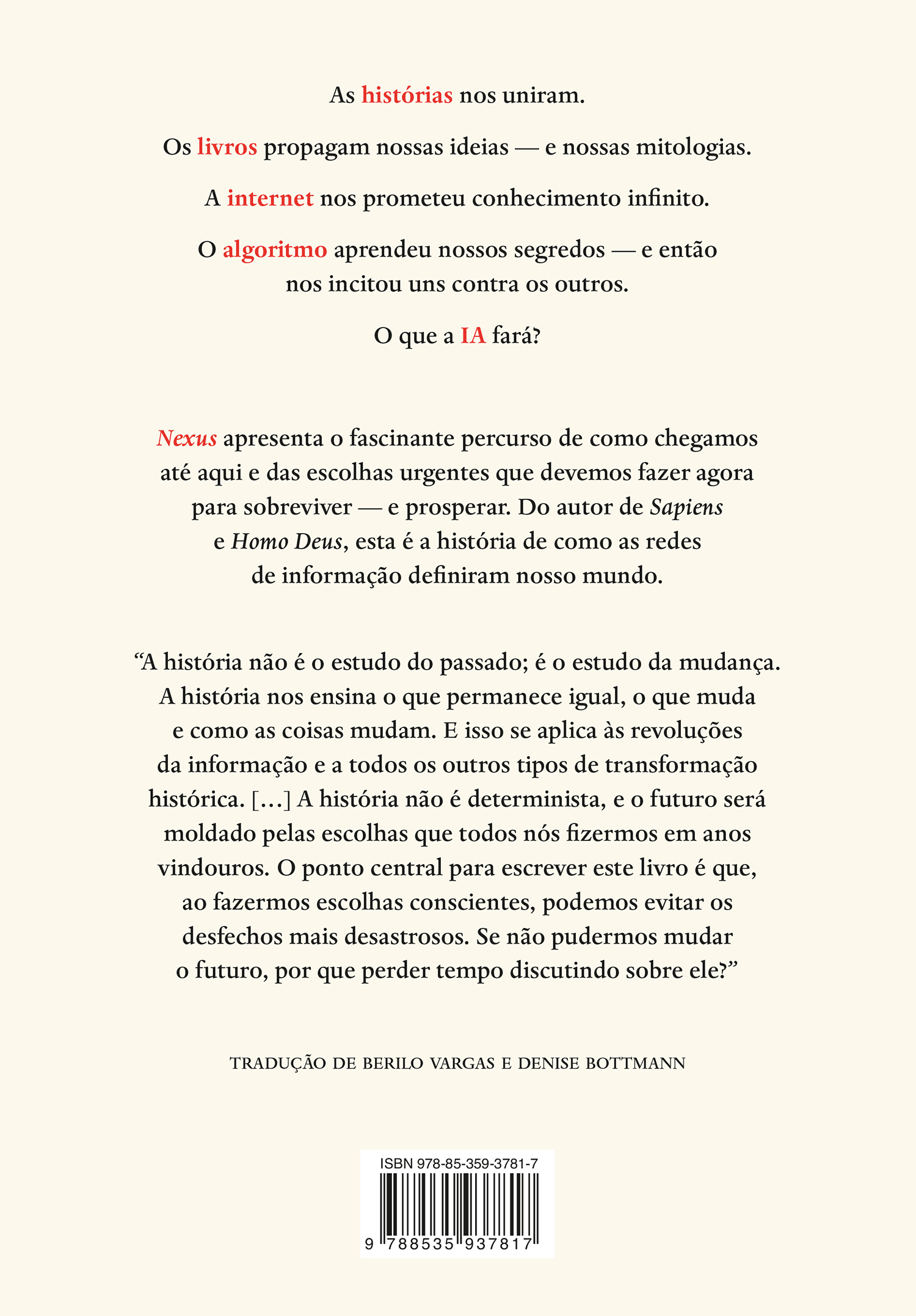 Nexus olha para a nossa história e avalia como o fluxo de informações moldou a nós e o mundo onde vivemos. Em uma narrativa que vai desde a Idade da Pedra e passa pela canonização da Bíblia, pelas primeiras caças às bruxas modernas, pelo stalinismo, pelo nazismo e pelo ressurgimento do populismo hoje, Yuval Noah Harari nos convida a examinar a complexa relação entre informação e verdade, burocracia e mitologia, sabedoria e poder. O autor explora como as várias sociedades e sistemas políticos utilizaram informações para atingir seus objetivos – para o bem e para o mal –, assim como as escolhas que precisamos fazer num momento em que a inteligência não humana ameaça a nossa própria existência.