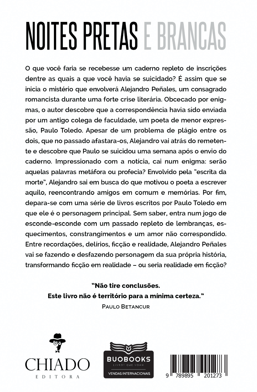 O que você faria se recebesse um caderno repleto de inscrições dentre as quais a que você havia se suicidado? É assim que se inicia o mistério que envolverá Alejandro Peñales, um consagrado romancista durante uma forte crise literária. Obcecado por enigmas, o autor descobre que a correspondência havia sido enviada por um antigo colega de faculdade, um poeta de menor expressão, Paulo Toledo. Apesar de um problema de plágio entre os dois, que no passado afastara-os, Alejandro vai atrás do remetente e descobre que Paulo se suicidou uma semana após o envio do caderno. Impressionado com a notícia, cai num enigma: serão aquelas palavras metáfora ou profecia? Envolvido pela “escrita da morte”, Alejandro sai em busca do que motivou o poeta a escrever aquilo, reencontrando amigos em comum e memórias. Por fim, depara-se com uma série de livros escritos por Paulo Toledo em que ele é o personagem principal. Sem saber, entra num jogo de esconde-esconde com um passado repleto de lembranças, esquecimentos, constrangimentos e um amor não correspondido. Entre recordações, delírios, ficção e realidade, Alejandro Peñales vai se fazendo e desfazendo personagem da sua própria história, transformando ficção em realidade – ou seria realidade em ficção? “Não tire conclusões. Este livro não é território para a mínima certeza.”, Paulo Betancur.