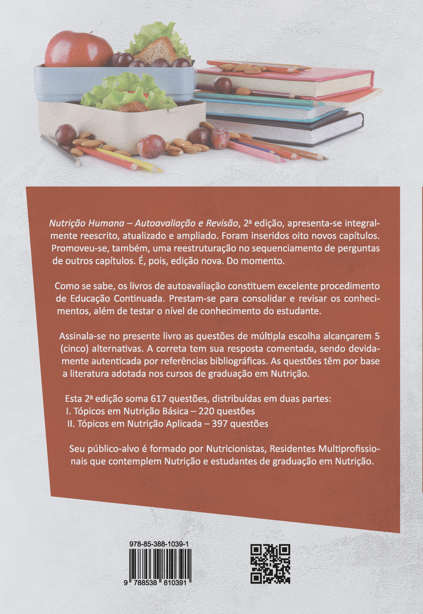Nutrição Humana - Autoavaliação e Revisão, 2ª edição, apresenta-se integralmente reescrito, atualizado e ampliado. Foram inseridos oito novos capítulos. Promoveu-se, também, uma reestruturação no sequenciamento de perguntas de outros capítulos. É, pois, edição nova. Do momento. Como se sabe, os livros de autoavaliação constituem excelente procedimento de Educação Continuada. Prestam-se para consolidar e revisar os conhecimentos, além de testar o nível de conhecimento do estudante. Assinala-se no presente livro as questões de múltipla escolha alcançarem 5 (cinco) alternativas. A correta tem sua resposta comentada, sendo devidamente autenticada por referências bibliográficas. As questões têm por base a literatura adotada nos cursos de graduação em Nutrição. Esta 2ª edição soma 617 questões, distribuídas em duas partes: I. Tópicos em Nutrição Básica - 220 questões II. Tópicos em Nutrição Aplicada - 397 questões Seu público-alvo é formado por Nutricionistas, Residentes Multiprofissionais que contemplem Nutrição e estudantes de graduação em Nutrição.