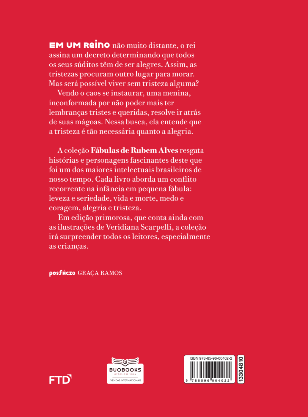 A coleção Fábulas de Rubem Alves resgata histórias e personagens fascinantes deste que foi um dos maiores intelectuais brasileiros de nosso tempo. Cada livro aborda um conflito recorrente na infância em pequena fábula: leveza e seriedade, vida e morte, medo ecoragem, alegria e tristeza. Em edição primorosa, que conta ainda com as ilustrações de Veridiana Scarpelli, a coleção irá surpreender todos os leitores, especialmente as crianças.1 review for O decreto da alegria