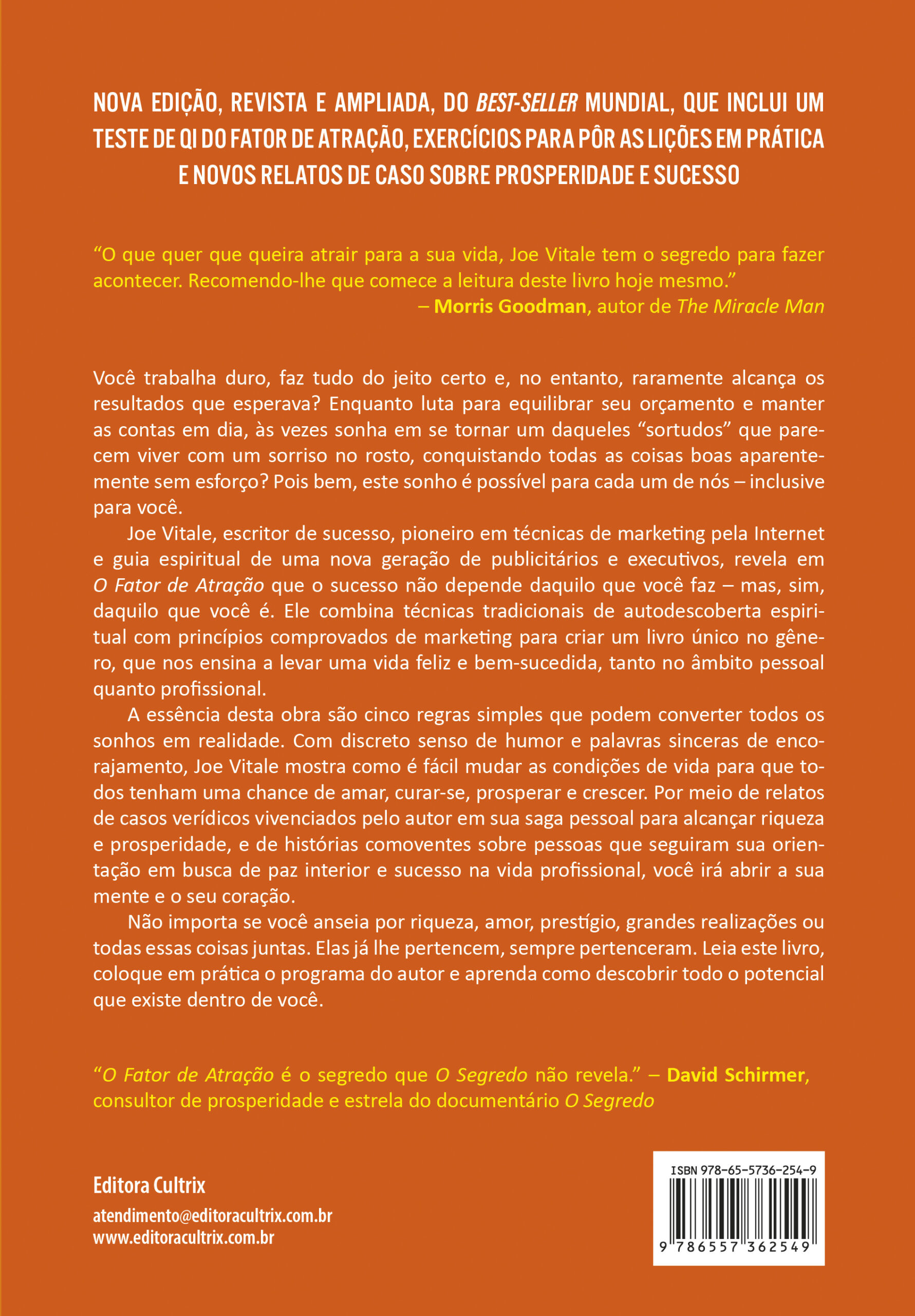 Neste livro, Joe Vitale, escritor de sucesso, pioneiro em técnicas de marketing pela internet e guia espiritual de uma nova geração de publicitários e executivos, revela que o sucesso não depende daquilo que você faz – mas sim daquilo que você é. Em o Fator de Atração, ele combina técnicas tradicionais de autodescoberta espiritual com princípios comprovados de marketing que nos ensina a levar uma vida feliz e bem-sucedida, tanto na vida pessoal quanto nos negócios. A essência desta obra são cinco regras simples que podem converter todos os sonhos em realidade. Com discreto senso de humor e palavras sinceras de encorajamento e exemplos reais, Joe Vitale mostra como é fácil mudar as condições de vida para que todos tenham uma chance de amar, curar-se, prosperar e crescer. Com esse programa você irá descobrir todo o potencial que existe em você!