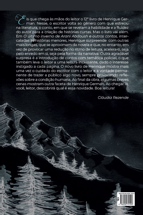 Eis que chega às mãos do leitor o 12o livro de Henrique German. Nesse, o escritor volta ao gênero com que estreou na literatura, o conto, em que se revelam a habilidade e a fluidez do autor para a criação de histórias curtas. Mas o livro vai além. Em O último inverno de Arani Abdoush e outros contos, intercaladas às histórias menores, Henrique surpreende com outras mais longas, que se aproximam da novela e que, no entanto, em vez de provocar uma redução no ritmo de leitura, acelera-o, seja pelo enredo em si, seja pela forma da narrativa. Outra agradável surpresa é a introdução de contos com temática policial, o que também leva o leitor a uma leitura incessante, dado o interesse instigado a cada página. O novo livro de Henrique mostra mais uma vez o cuidado do escritor com o leitor e a vontade permanente de trazer a público algo novo, sempre provocando reflexões sobre a condição humana. Ao final da obra, algumas breves cenas mostram outra faceta de Henrique German. Ao chegar lá, você, leitor, descobrirá qual é essa novidade. Boa leitura! Cláudia Rezende
