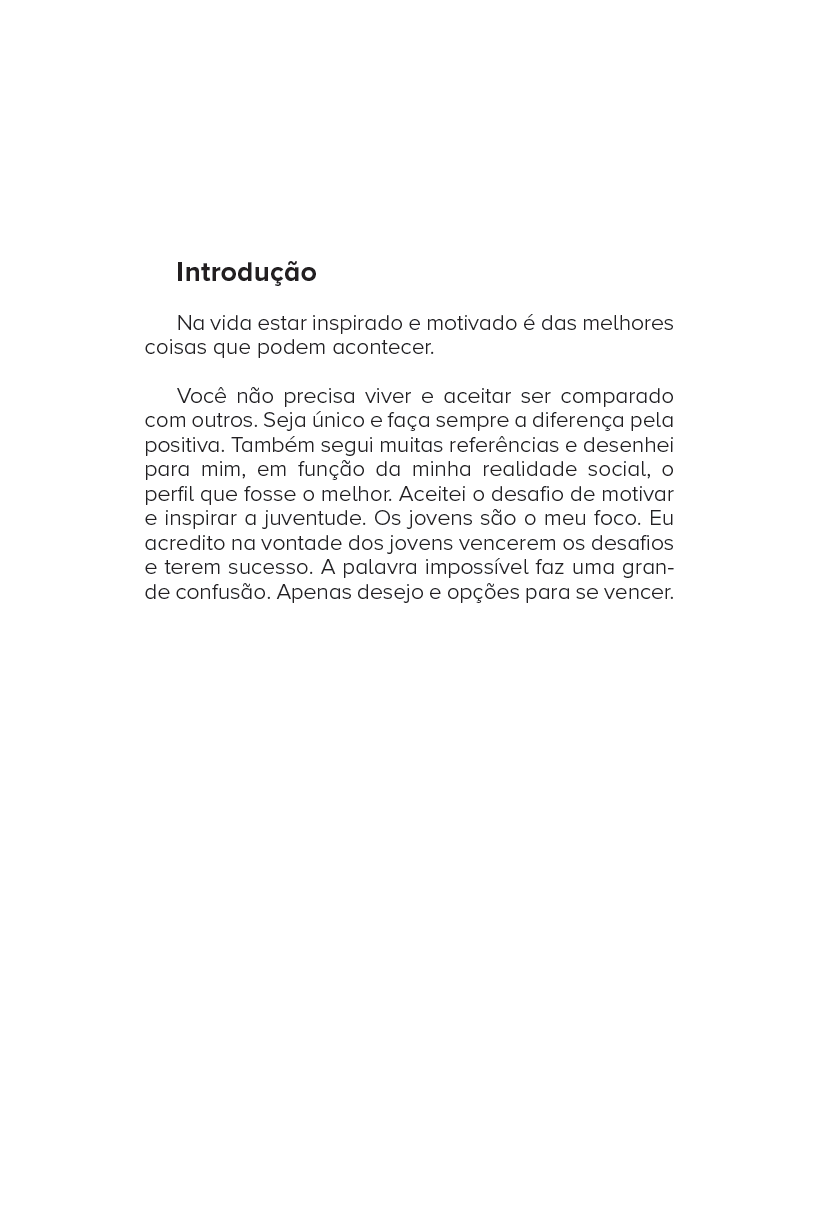 Você não precisa viver e aceitar ser comparado com outros. Seja único e faça sempre a diferença pela positiva. Também segui muitas referências e desenhei para mim, em função da minha realidade social, o perfil que fosse o melhor. Aceitei o desafio de motivar e inspirar a juventude. Os jovens são o meu foco. Eu acredito na vontade dos jovens vencerem os desafios e terem sucesso. A palavra impossível faz uma grande confusão. Apenas desejo e opções para se vencer.