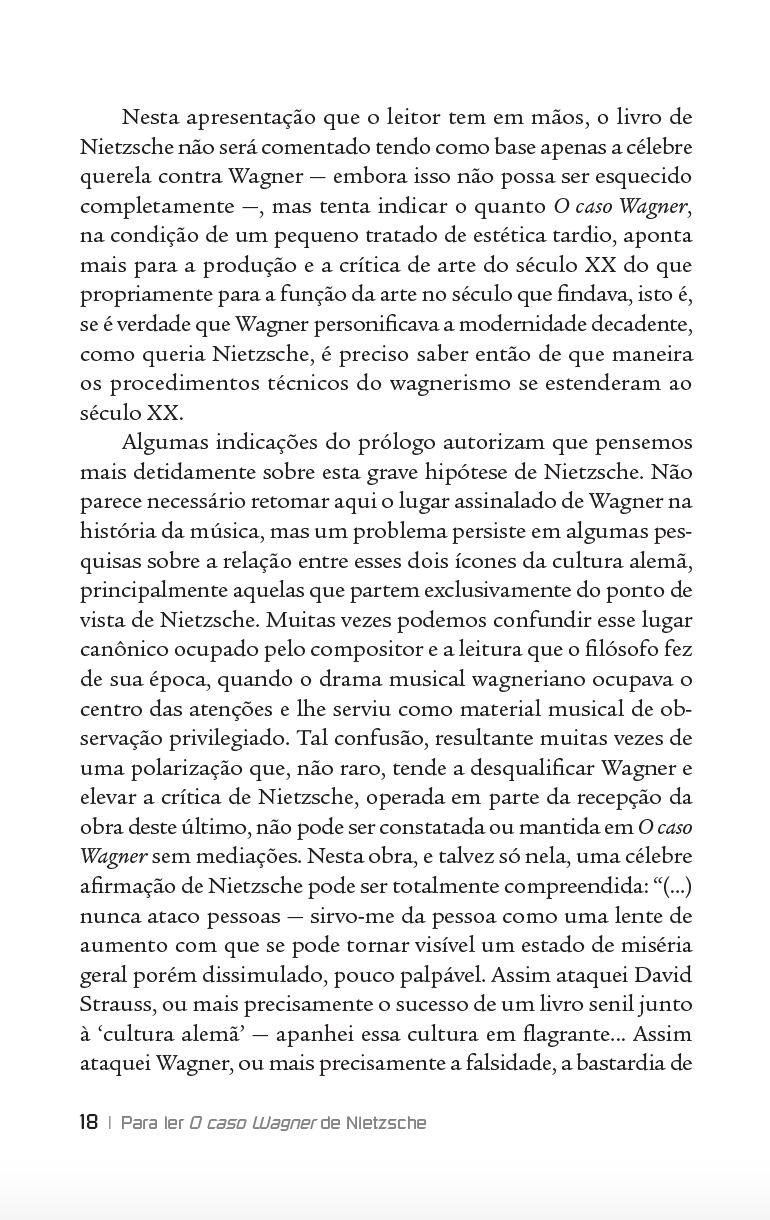 O caso Wagner (1888) foi publicado no último ano de atividade intelectual regular de Nietzsche, próximo do colapso psíquico que o deixaria uma década em estado semivegetativo, até sua morte em 1900. Nele, seu autor retoma o tema da música em uma perspectiva radicalmente distante daquela exposta em seu livro de estreia, O nascimento da tragédia. Sua estética final aponta para uma personificação da modernidade no interior do projeto wagneriano de uma Obra de arte total. Este livro discute a crítica de Nietzsche aos procedimentos técnicos de Richard Wagner, indicando o quanto suas reflexões anteciparam problemas retomados e ampliados com o advento da Teoria Crítica, principalmente na obra de Theodor Adorno.