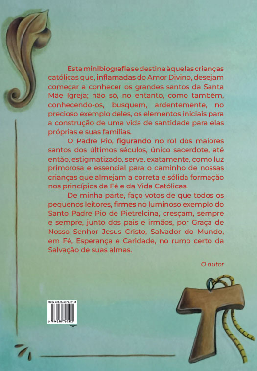 Esta minibiografia se destina àquelas crianças católicas que, inflamadas do Amor Divino, desejam começar a conhecer os grandes santos da Santa Mãe Igreja; não só, no entanto, como também, conhecendo-os, busquem, ardentemente, no precioso exemplo deles, os elementos iniciais para a construção de uma vida de santidade para elas próprias e suas famílias. O Padre Pio, figurando no rol dos maiores santos dos últimos séculos, único sacerdote, até então, estigmatizado, serve, exatamente, como luz primorosa e essencial para o caminho de nossas crianças que almejam a correta e sólida formação nos princípios da Fé e da Vida Católicas. De minha parte, faço votos de que todos os pequenos leitores, firmes no luminoso exemplo do Santo Padre Pio de Pietrelcina, cresçam, sempre e sempre, junto dos pais e irmãos, por Graça de Nosso Senhor Jesus Cristo, Salvador do Mundo, em Fé, Esperança e Caridade, no rumo certo da Salvação de suas almas.