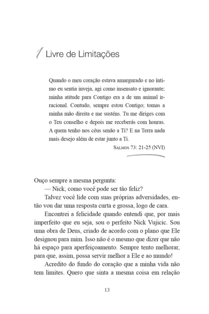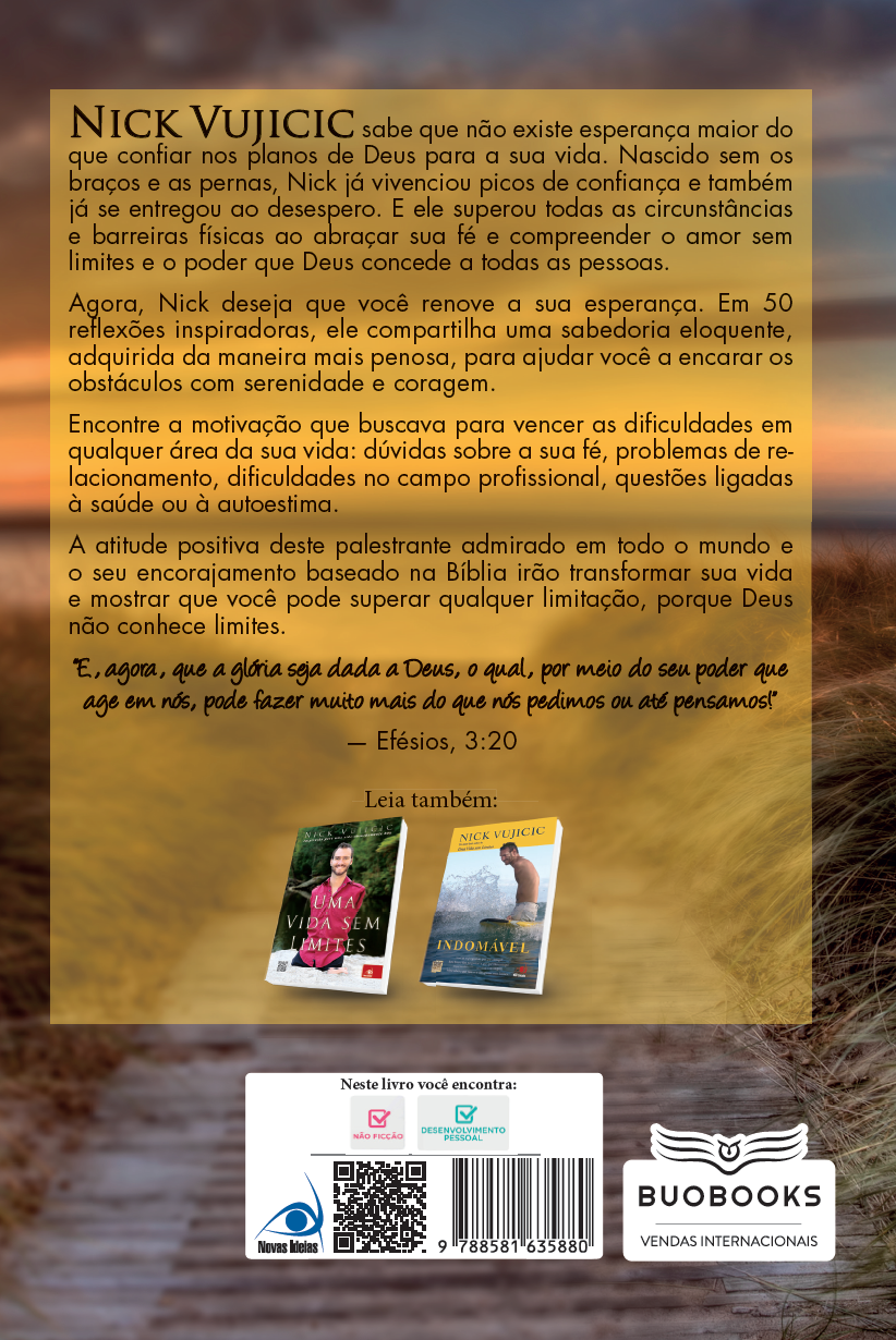 Nick Vujicic sabe que não existe esperança maior do que confiar nos planos de Deus para a sua vida. Nascido sem os braços e as pernas, Nick já vivenciou picos de confiança e também já se entregou ao desespero. E ele superou todas as circunstâncias e barreiras físicas ao abraçar sua fé e compreender o amor sem limites e o poder que Deus concede a todas as pessoas. Agora, Nick deseja que você renove a sua esperança. Em 50 reflexões inspiradoras, ele compartilha uma sabedoria eloquente, adquirida da maneira mais penosa, para ajudar você a encarar os obstáculos com serenidade e coragem. Encontre a motivação que buscava para vencer as dificuldades em qualquer área da sua vida: dúvidas sobre a sua fé, problemas de relacionamento, dificuldades no campo profissional, questões ligadas à saúde ou à autoestima. A atitude positiva deste palestrante admirado em todo o mundo e o seu encorajamento baseado na Bíblia irão transformar sua vida e mostrar que você pode superar qualquer limitação, porque Deus não conhece limites.