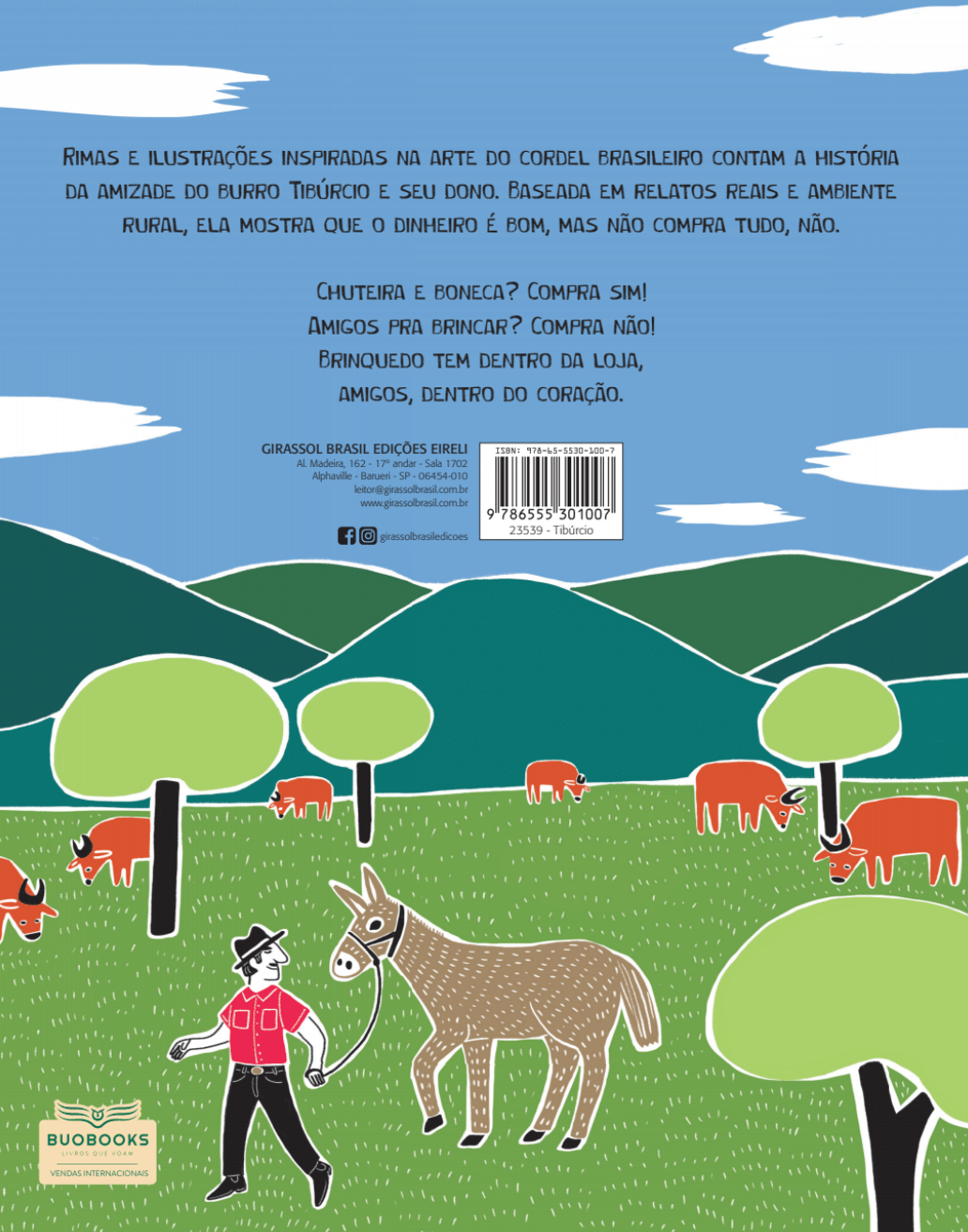 Rimas e ilustrações inspiradas na arte do cordel brasileiro contam a história da amizade do burro Tibúrcio e seu dono.