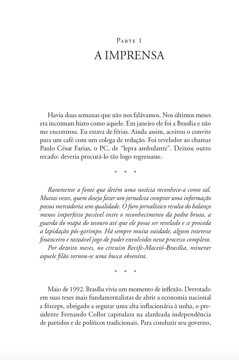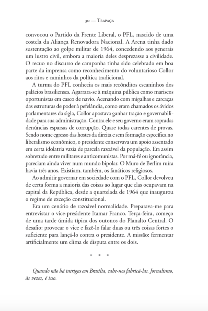 Pela primeira vez o jornalista Luís Costa Pinto – que há quase 30 anos deu início ao processo que resultou na queda do presidente Fernando Collor – revela os bastidores de uma investigação dramática, num tempo em que nem a Polícia Federal nem o Ministério Público estavam aparelhados para cumprir com o papel que exercem hoje. Trapaça – Volume 1 – Collor é o primeiro de quatro livros da saga que pretende contar, em ritmo de thriller policial e literário, os bastidores do poder no Brasil ao longo de três décadas, da ascensão e queda de Collor aos dias de hoje. Essa história começa em maio 1992, quando o Brasil viu sua jovem democracia ser consolidada pela eleição e em seguida pelo processo de impeachment de Fernando Collor.