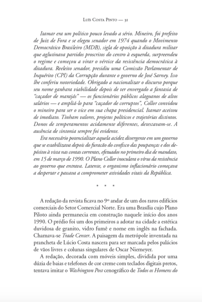 O primeiro presidente eleito no país depois de 21 anos de ditadura foi cassado com base num processo de investigação iniciado e conduzido pela imprensa. O irmão do presidente da República, Pedro Collor, revelou esquemas de corrupção do governo numa entrevista bombástica ao jornalista Luís Costa Pinto, então com apenas 23 anos e uma determinação intensa para a investigar os fatos. Depois, o motorista que servia à família presidencial conduziu parlamentares de uma CPI a documentos que embasaram a cassação do presidente. O país se uniu para superar o trauma e buscar soluções que não paralisassem nem a reconstrução democrática, nem a economia nacional. Esse é o pano de fundo do 1º volume de Trapaça, a saga política no universo paralelo brasileiro. Irregularidades, tráfico de influência, lobbies, negócios escusos, a busca insaciável do poder, paixões intensas por mulheres fatais, num ambiente em que se ressalta a crônica corrupção do estado brasileiro, antecipando o que vivemos hoje. LIÇÃO DE JORNALISMO E HISTÓRIA Luís Costa Pinto era ainda um jovem e pouco experiente jornalista pernambucano de 23 anos quando se deparou com o caso que levaria ao primeiro impeachment de presidente brasileiro eleito pelo voto, após 24 anos de ditadura militar. Quase trinta anos depois dos acontecimentos, e distanciado deles, o agora experiente jornalista e consultor de comunicação (e política) os rememora. E como rememora! O relato, alucinante e de perder o fôlego, revela os bastidores mais secretos de acontecimentos que julgávamos conhecer inteiramente – mas não. O que se lê como romance ou thriller traz um enredo épico, com personagens grandiosos ou não, daqueles que quase não se veem mais. Como comparar figuras históricas como Franco Montoro, Mário Covas, Ruth Cardoso, Paulo Brossard, José Dirceu – do lado democrático – ou Ernesto Geisel, Jarbas Passarinho – do outro lado – com os atuais anões (pois disso não passam) da cena política brasileira atual? Como comparar as ações heroicas dos jornalistas dos anos 1990, quando nem internet havia, suas investigações penosas, exaustivas, com a ação dos jornalistas “pesquisadores” de hoje, que tudo buscam no Google, ou dos que apenas recebem dossiês, gravações (legais e ilegais) e documentos vazados de policiais ou procuradores que os manipulam? Luís Costa Pinto, testemunha da História, foi também um de seus maiores protagonistas. Ele praticamente detonou – com uma entrevista bombástica do irmão do presidente – o processo de deposição daquele que, como hoje, se elegera sobre o fracasso dos que representariam a “antiga política”. Este é também um livro que importuna e faz pensar, como afirma o filósofo Renato Janine Ribeiro em seu prefácio. E se pergunta: como foi que aqueles que se uniram por um Brasil melhor, em 1992, conseguiram se desunir tendo tanto ódio entre si, a ponto de abrirem as portas para um personagem cuja força não é própria, mas reside apenas na fraqueza de todos os demais atores da política brasileira? O impeachment de 1992 amalgamou a reconstrução das instituições brasileiras pós-ditadura. O processo que depôs a presidenta Dilma Rousseff em 2016 voltou a fracioná-las. A vaidade, pecado capital, costura com os fios dramáticos das suas perdições os retalhos da narrativa. Ao final deste livro, um vazio: o que veio depois, e aonde chegamos? Aqui, como afirma outro prefaciador, o escritor Xico Sá, terminada a leitura o que surge é uma espécie de vazio que, tenho certeza, Luís Costa Pinto preencherá com os outros volumes prometidos para breve – a história em seu inexorável curso, até os dias atuais. Pena que a cada volume, isso é certo, os personagens mais se apequenem do que se agigantem. Esta é a grande tragédia de nossos tempos. Para um Churchill e um Kennedy, um Putin e um Trump. Para um Getúlio Vargas e um Juscelino Kubitschek, quatro Bolsonaros. O tempora! O mores!You must be logged in to post a review.